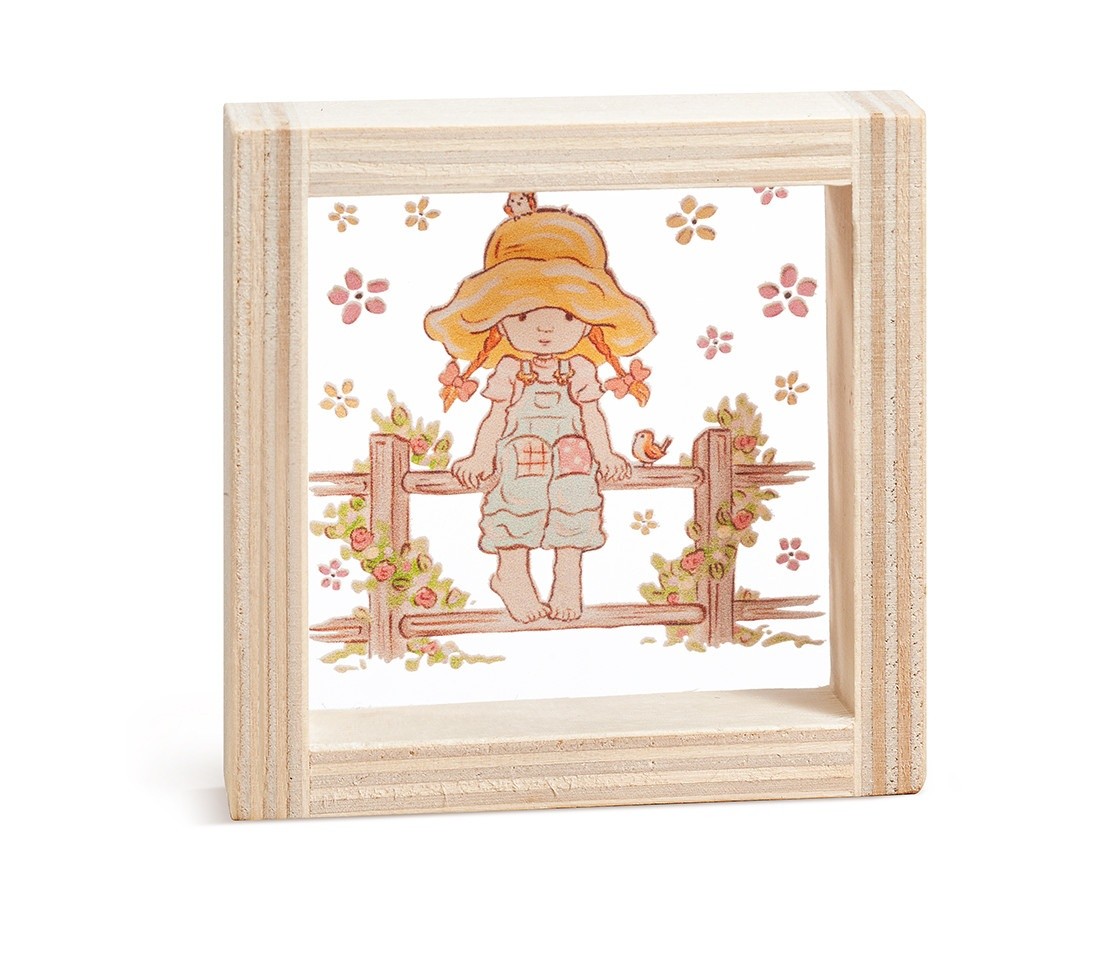 Ξύλινο καδράκι με print plexiglass παράσταση.Η παράσταση απεικονίζει σε διάφανο χρώμα την Sarah Kay στο φράχτη.