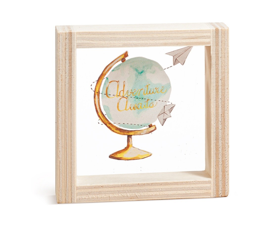 Ξύλινο καδράκι με print plexiglass παράσταση.Η παράσταση απεικονίζει σε διάφανο χρώμα την υδρόγειο και moto "Adventure Awaits".