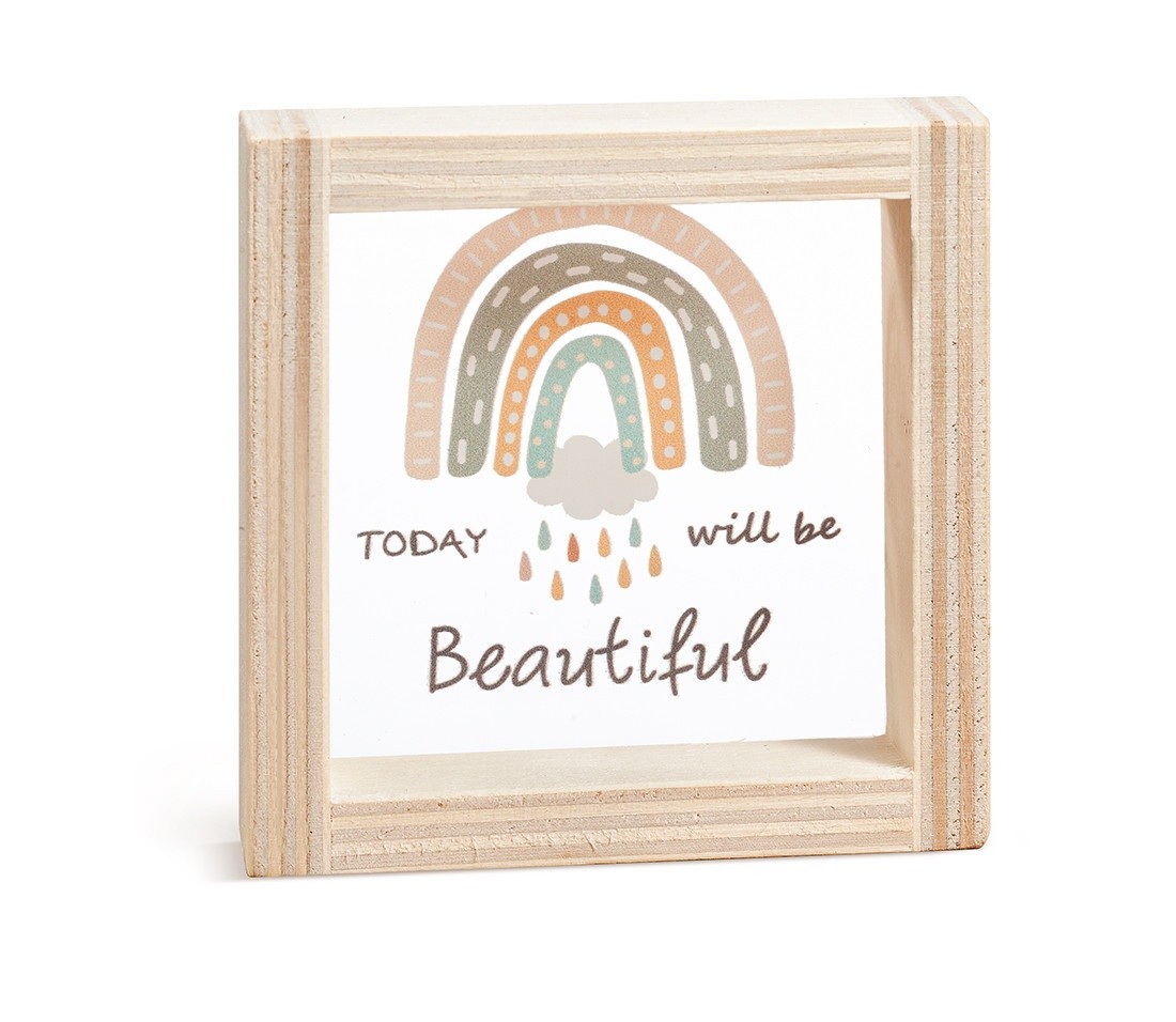 Ξύλινο καδράκι με print plexiglass παράσταση.Η παράσταση απεικονίζει σε διάφανο χρώμα το ουράνιο τόξο μετά τη βροχή και moto "Today wil be beautiful".