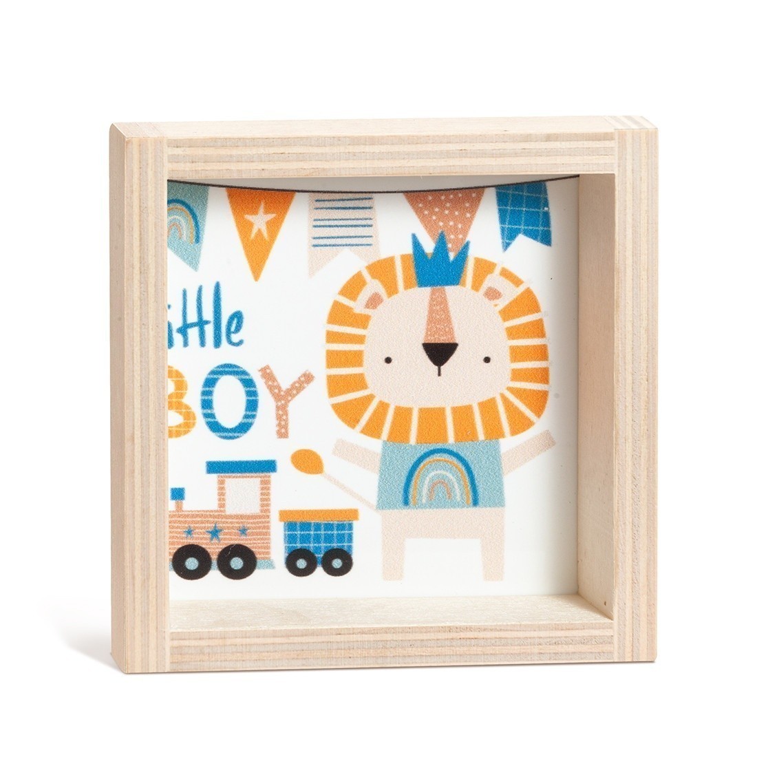 Ξύλινο καδράκι με print plexiglass παράσταση.Η παράσταση απεικονίζει σε λευκό χρώμα ένα λιονταράκι σε σιέλ αποχρώσεις.