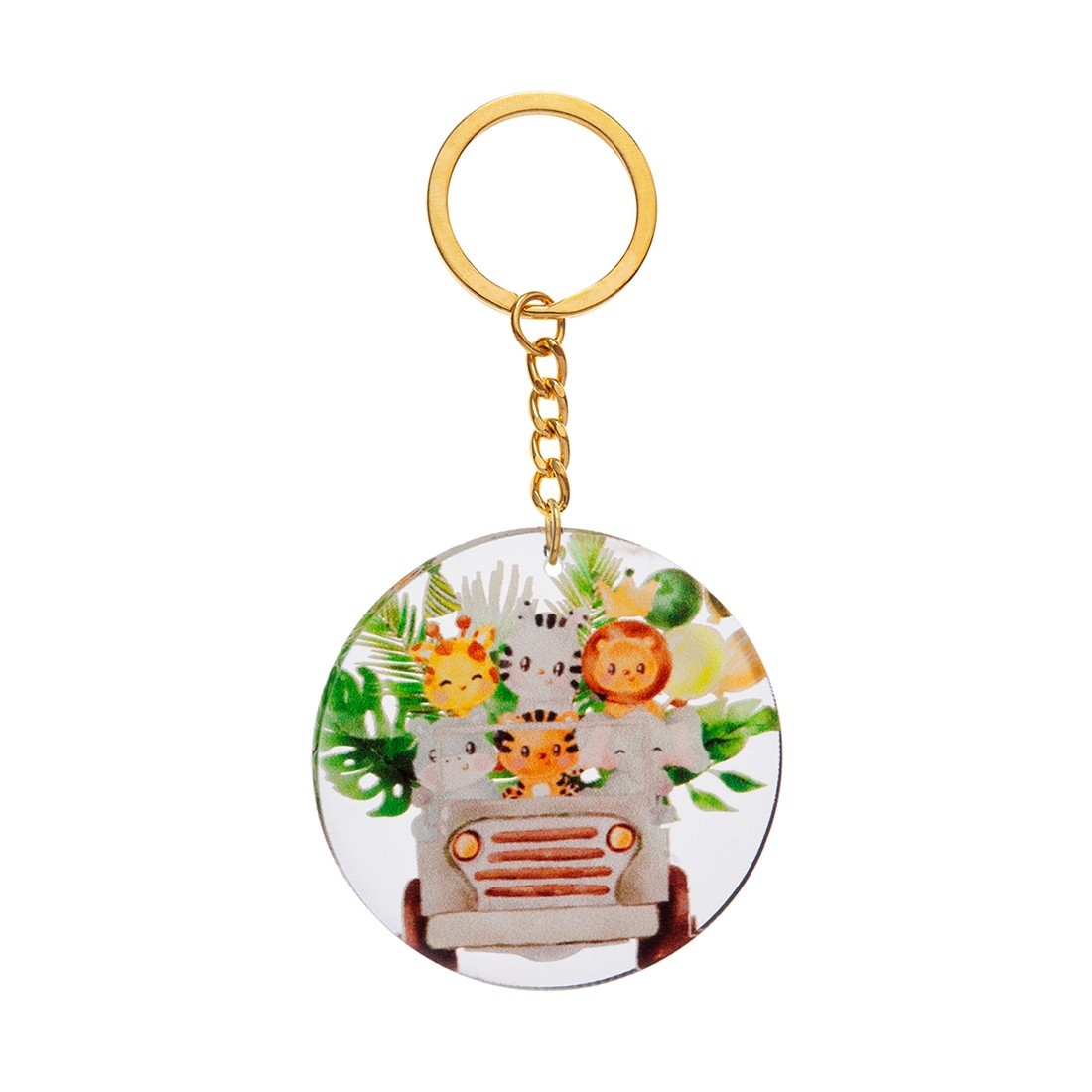 Μπρελόκ με στρογγυλή print παράσταση από plexiglass σε διάφανο χρώμα. Η παράσταση απεικονίζει τα ζωάκια της ζούγκλας να πηγαίνουν για safari.