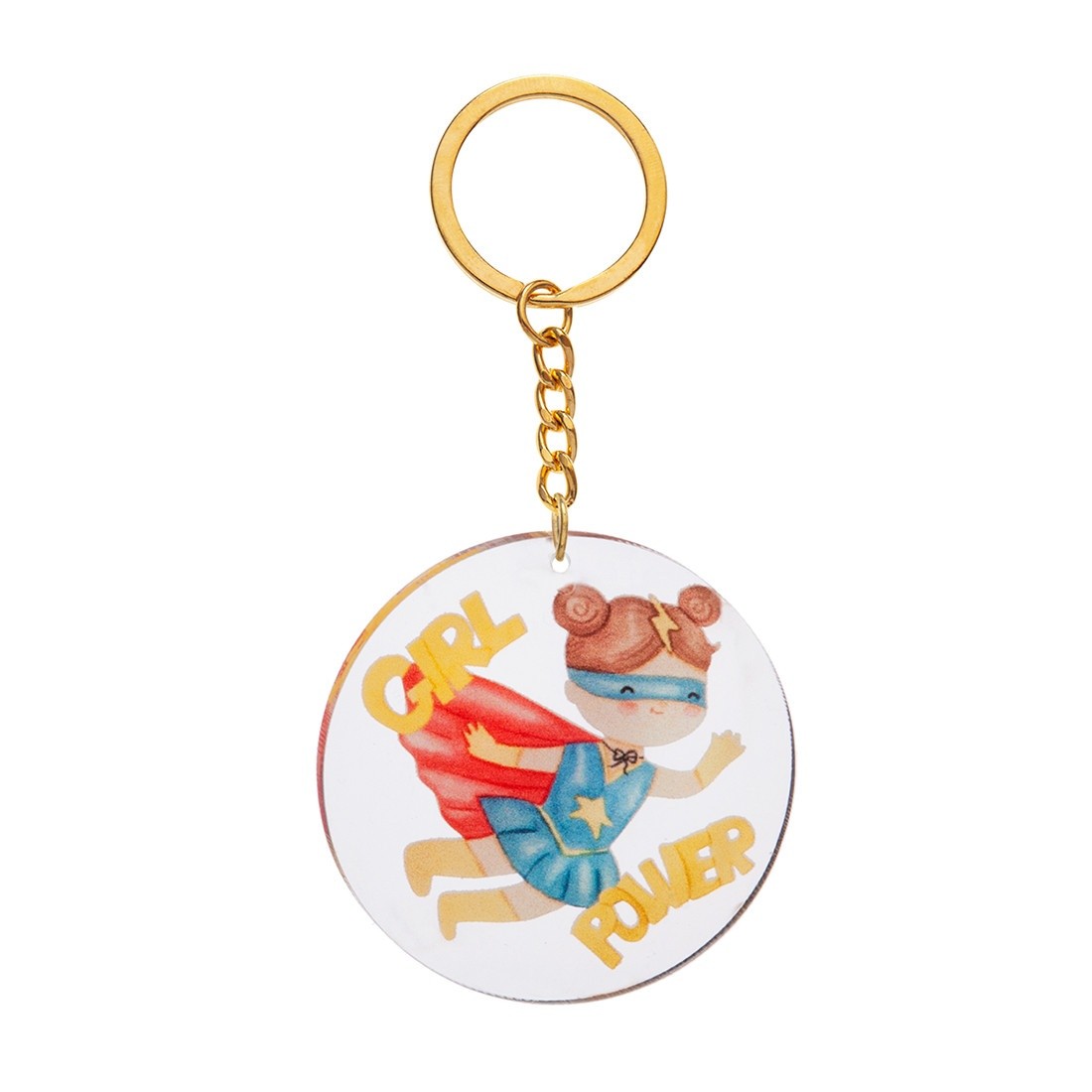 Μπρελόκ με στρογγυλή print παράσταση από plexiglass σε διάφανο χρώμα. Η παράσταση απεικονίζει την Super Girl power.