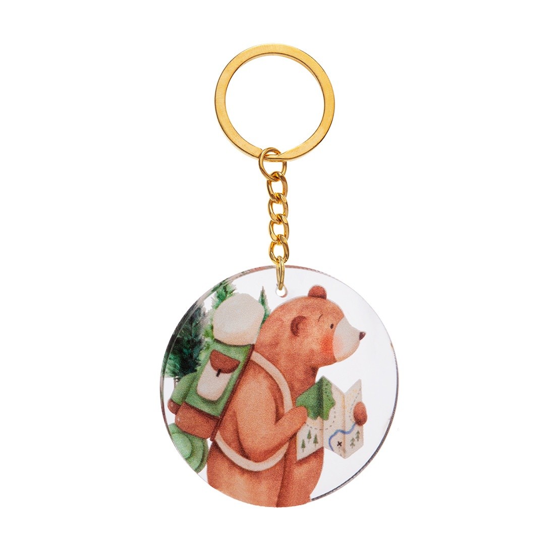 Μπρελόκ με στρογγυλή print παράσταση από plexiglass σε διάφανο χρώμα. Η παράσταση απεικονίζει την αρκούδα να πηγαίνει για camping.