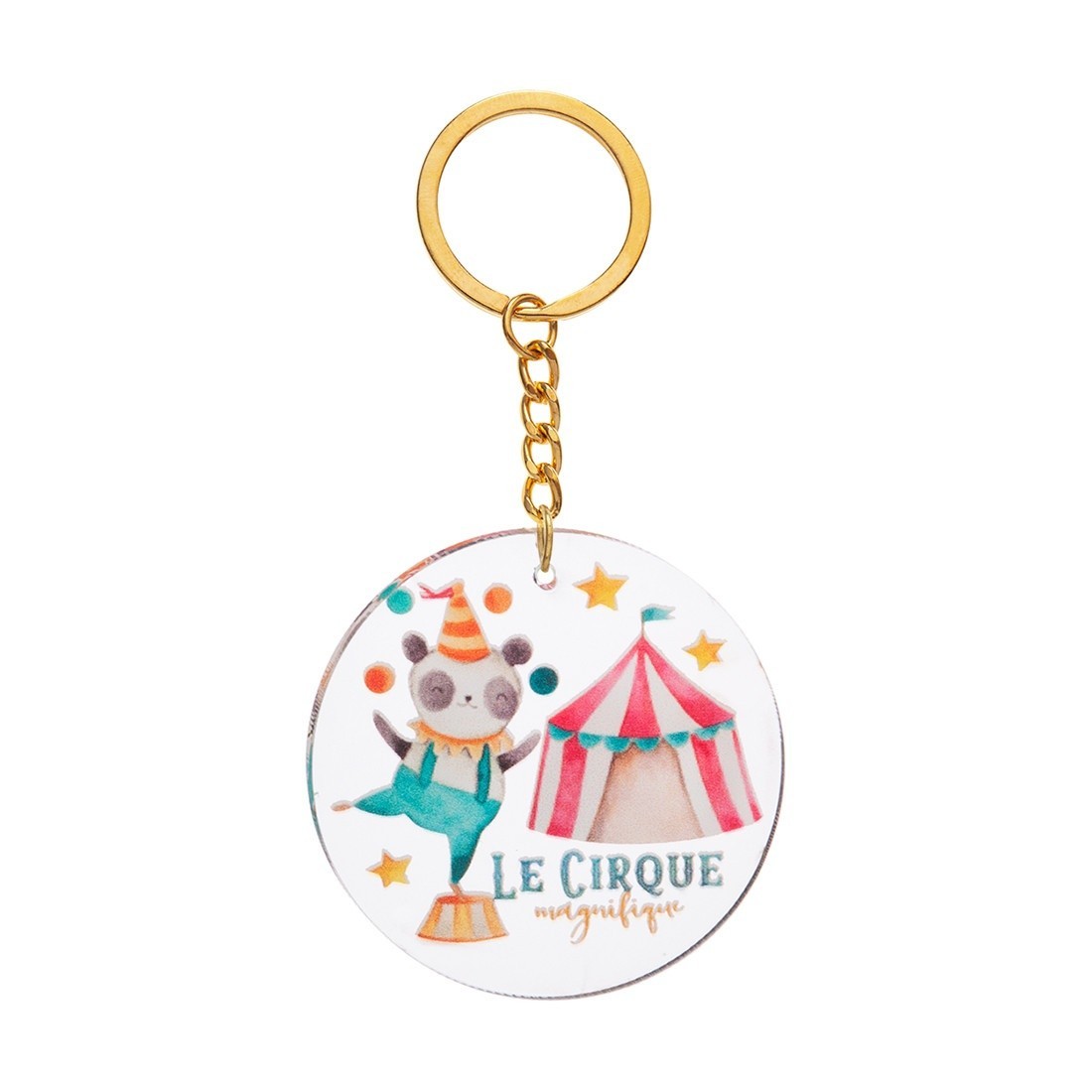 Μπρελόκ με στρογγυλή print παράσταση από plexiglass σε διάφανο χρώμα. Η παράσταση απεικονίζει το panda να κάνει ακροβατικά με φόντο τη σκηνή του τσίρκου.