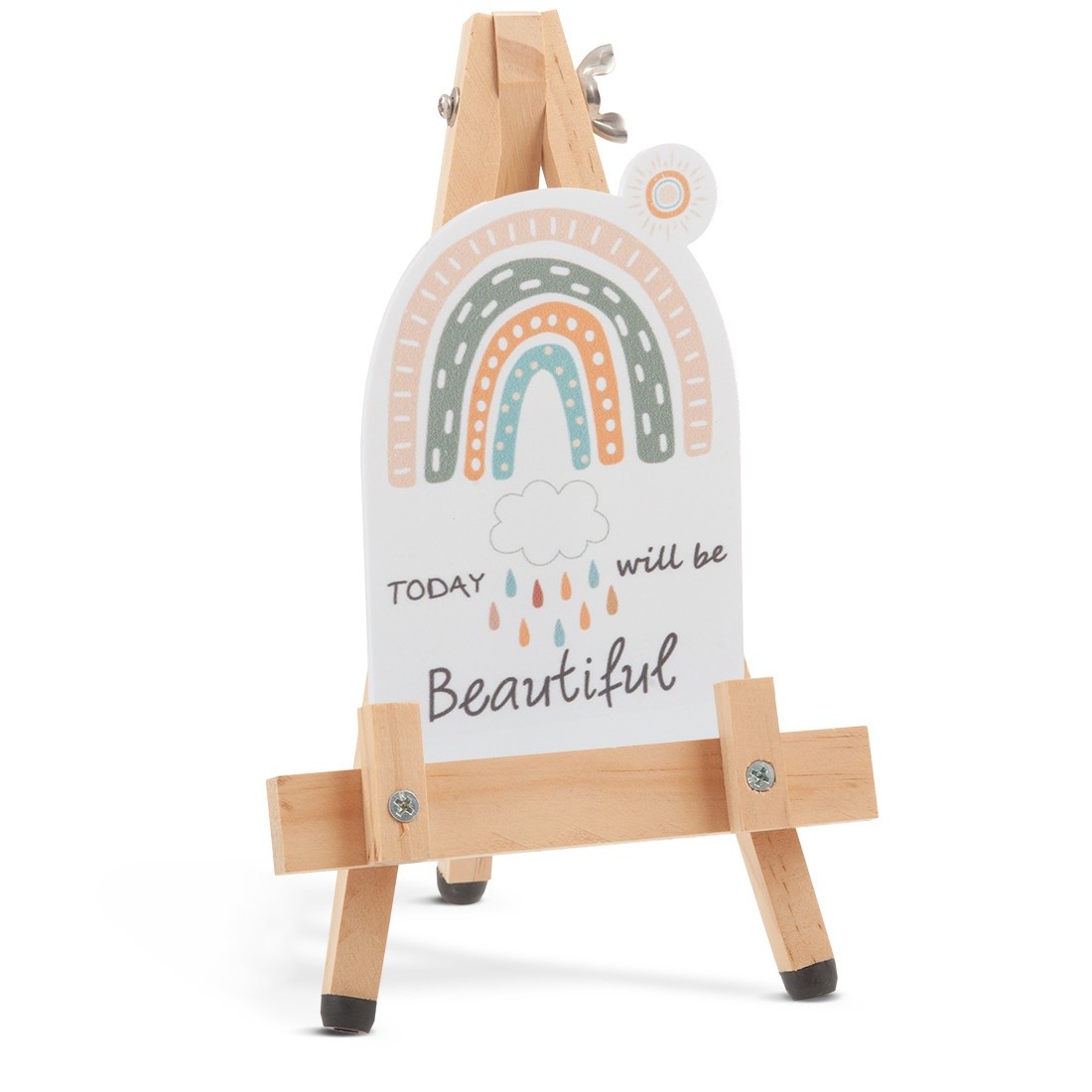 Ξύλινο καβαλέτο με print plexiglass κοπτικό.Η παράσταση απεικονίζει σε λευκό χρώμα το ουράνιο τόξο μετά τη βροχή και moto "Today wil be beautiful" .