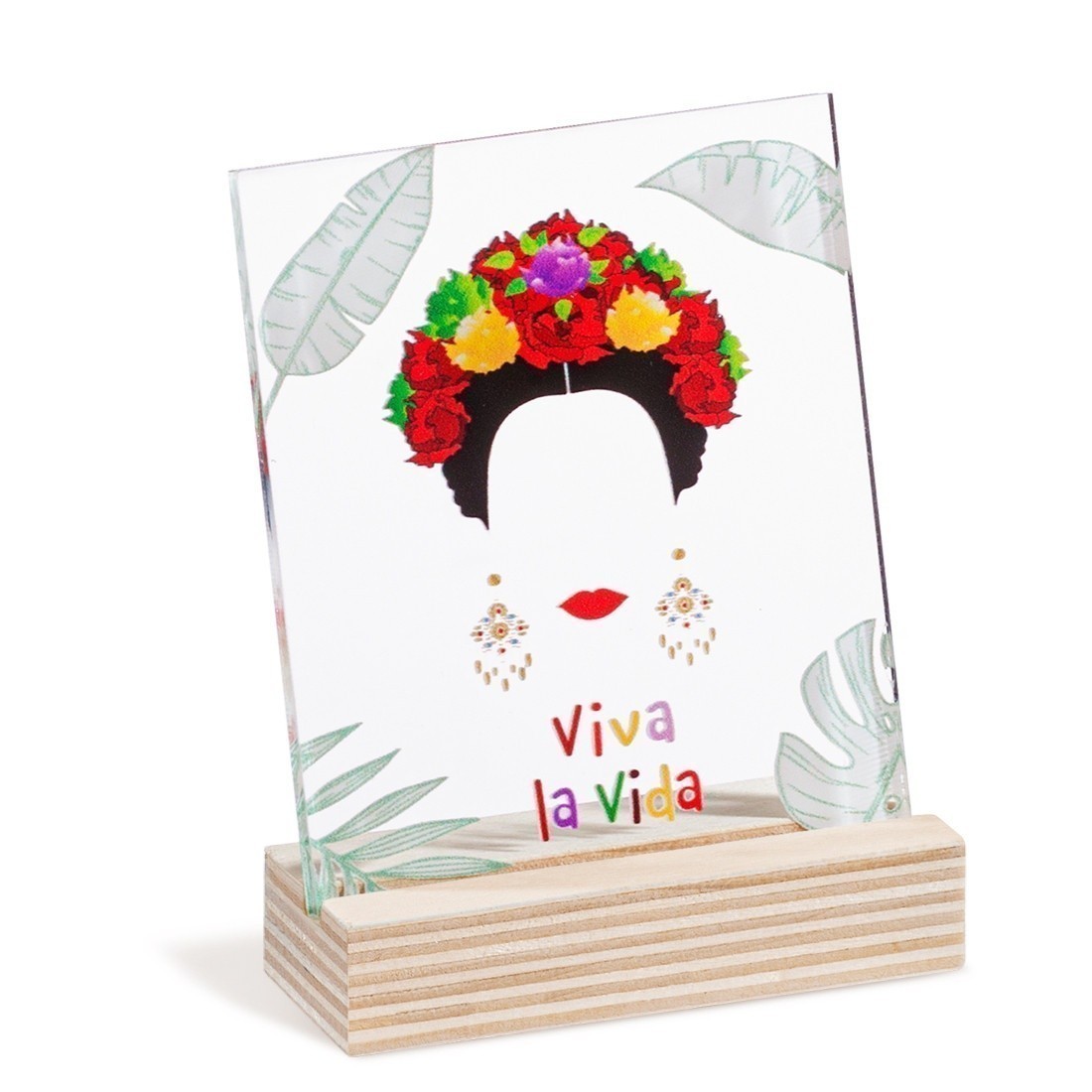 Ξύλινη βάση με παραλληλόγραμμο print καδράκι σε διάφανο plexiglass. Η παράσταση απεικονίζει την Frida Khalo και moto " Viva la vida"