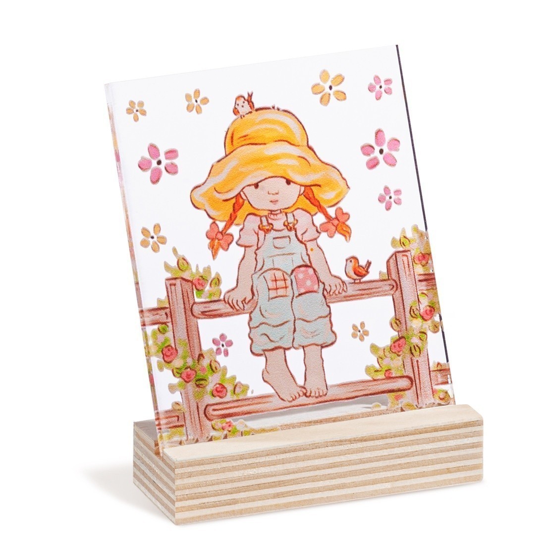 Ξύλινη βάση με παραλληλόγραμμο print καδράκι σε διάφανο plexiglass. Η παράσταση απεικονίζει την Sarah Kay στο φράχτη.