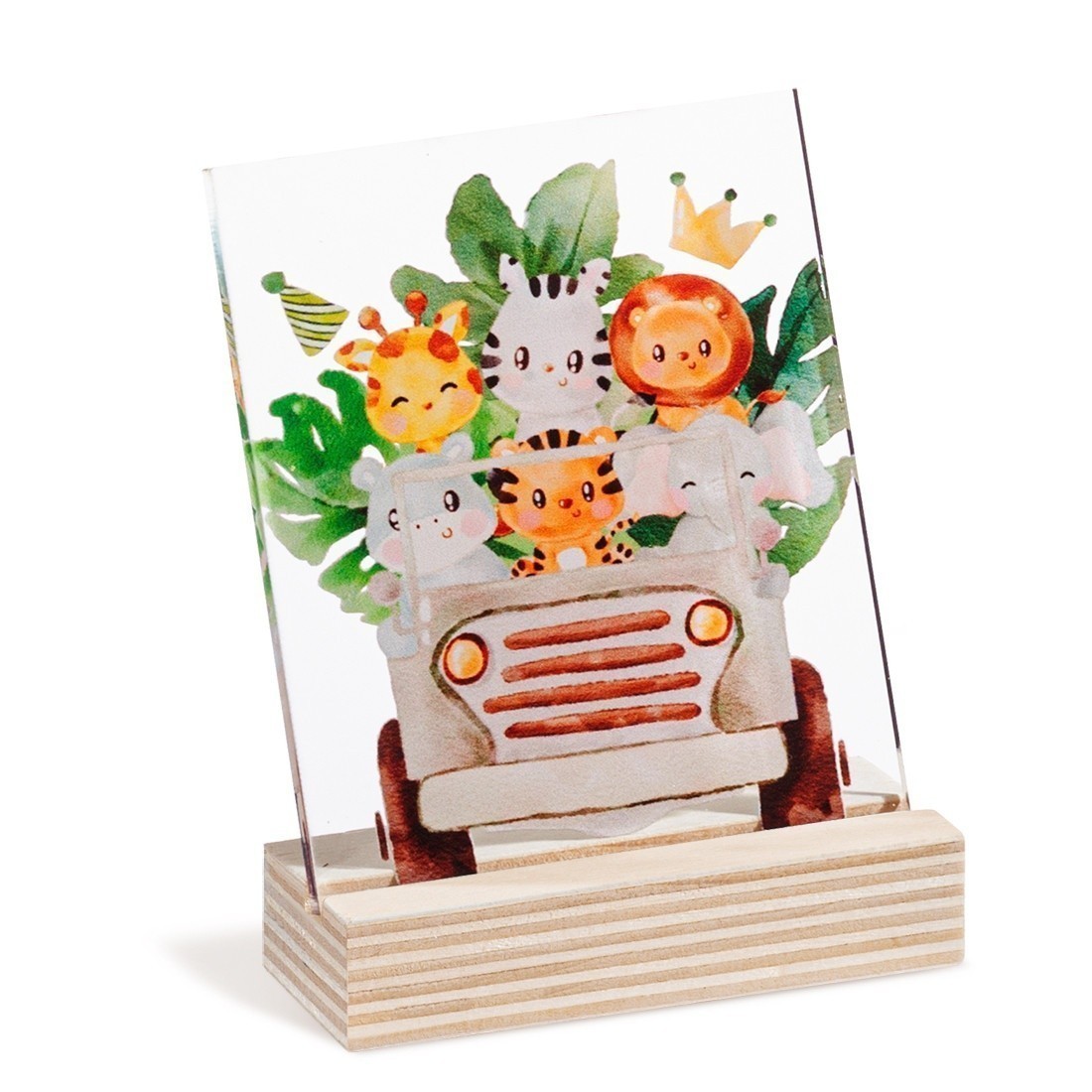 Ξύλινη βάση με παραλληλόγραμμο print καδράκι σε διάφανο plexiglass. Η παράσταση απεικονίζει τα ζωάκια της ζούγκλας να πηγαίνουν για safari.
