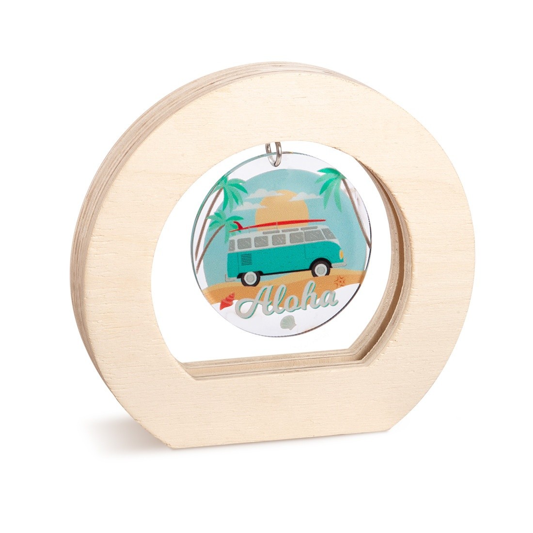 Ξύλινο οβάλ καδράκι σε natural χρώμα. Το εσωτερικό είναι διακοσμημένο με κρεμαστή plexiglass print παράσταση σε στρογγυλό σχήμα με θέμα βεραμάν van Aloha .