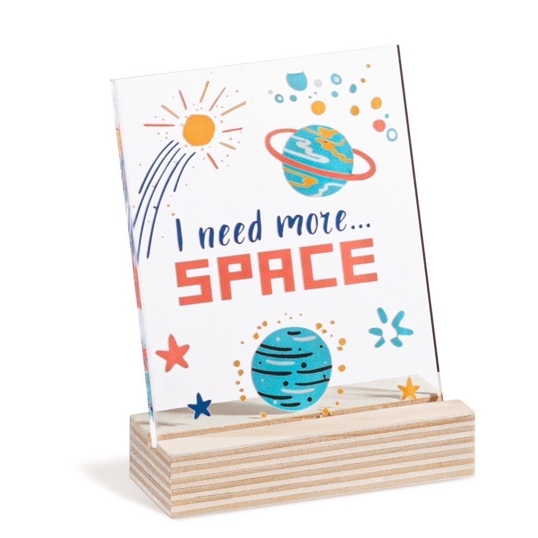 Ξύλινη βάση με παραλληλόγραμμο print καδράκι σε διάφανο plexiglass. Η παράσταση απεικονίζει το διάστημα και moto "I need more…SPACE".