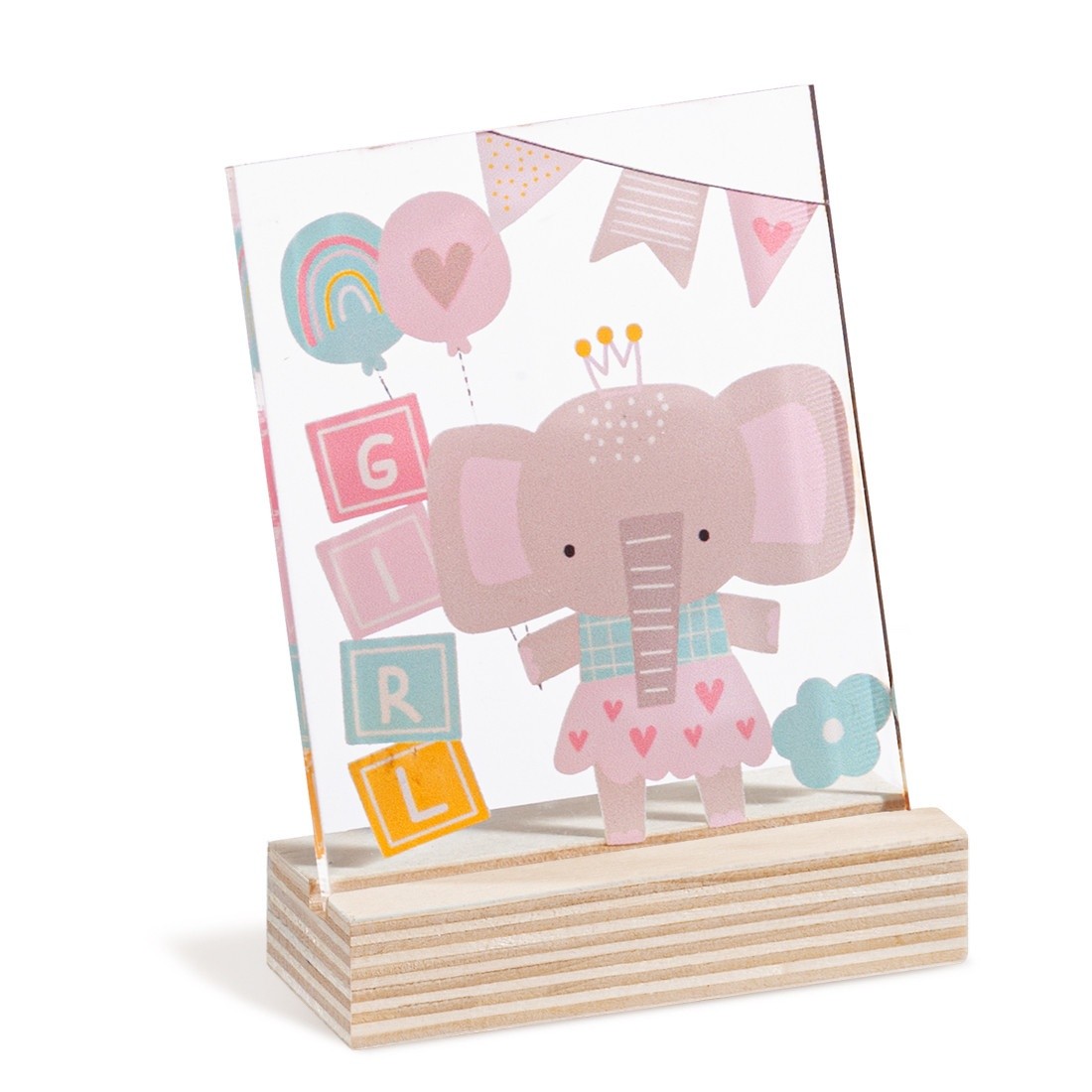 Ξύλινη βάση με παραλληλόγραμμο print καδράκι σε διάφανο plexiglass. Η παράσταση απεικονίζει την ελεφαντίνα σε ροζ αποχρώσεις.