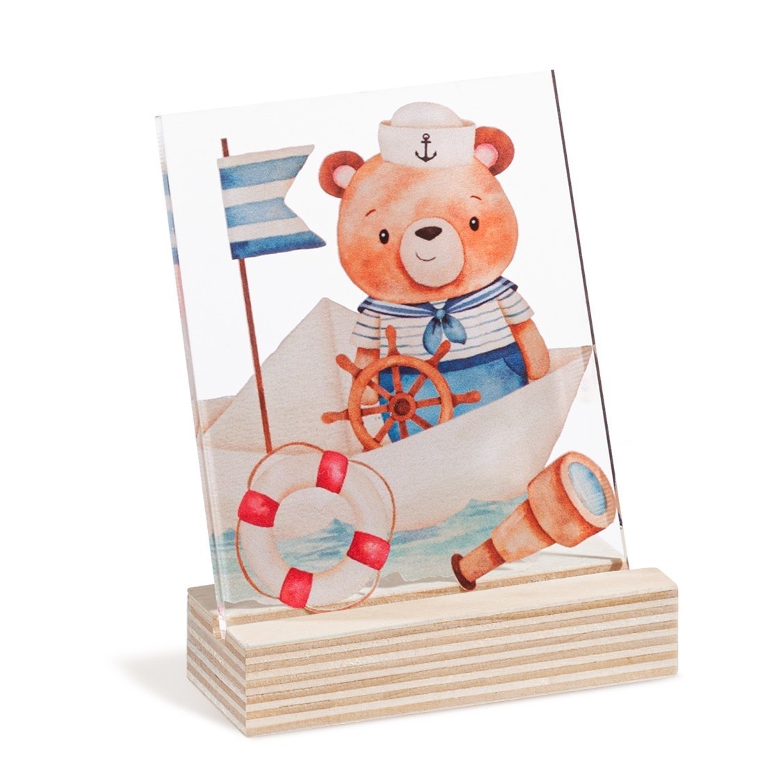 Ξύλινη βάση με παραλληλόγραμμο print καδράκι σε διάφανο plexiglass. Η παράσταση απεικονίζει το αρκουδάκι να αρμενίζει με τη βαρκούλα του.
