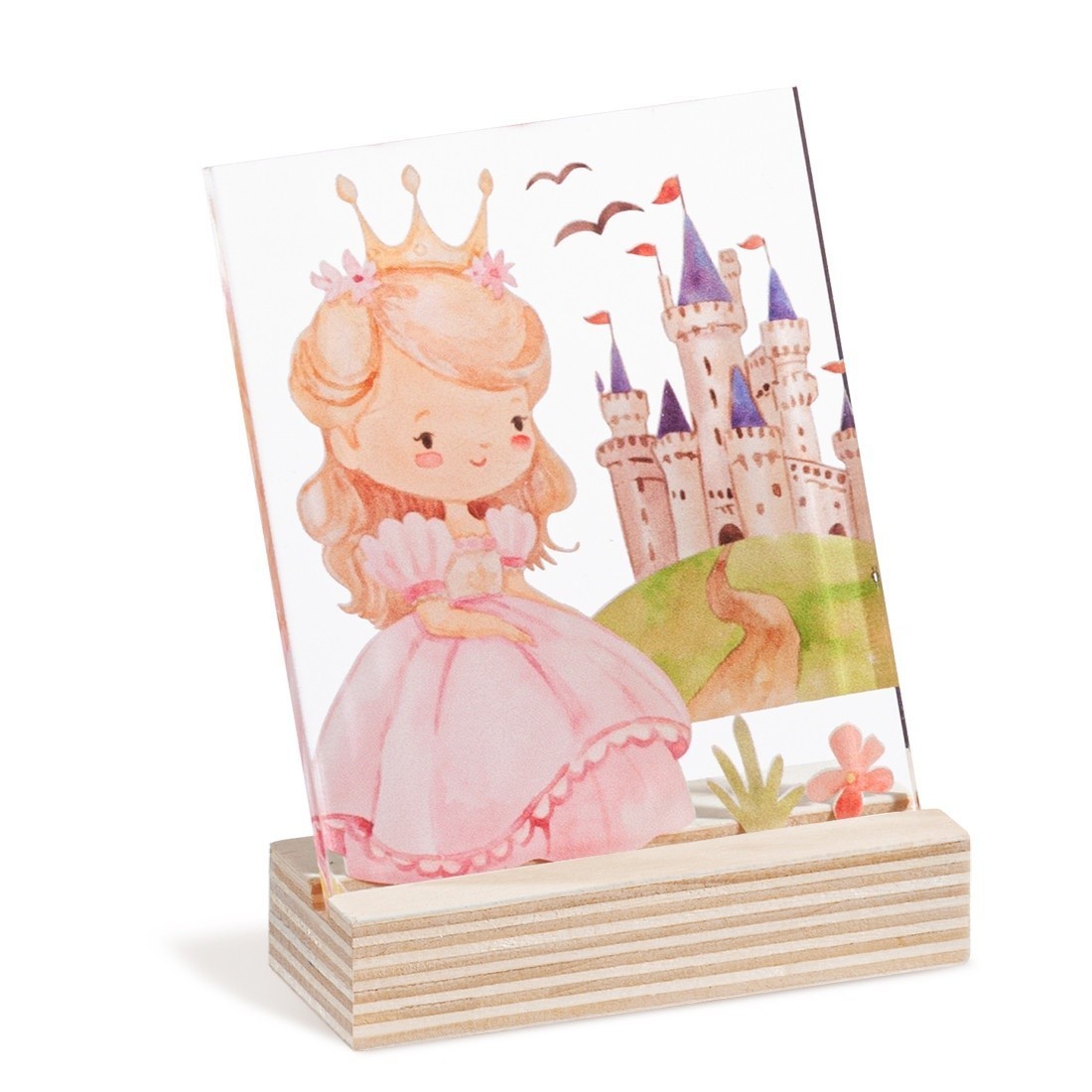 Ξύλινη βάση με παραλληλόγραμμο print καδράκι σε διάφανο plexiglass. Η παράσταση απεικονίζει την πριγκίπισσα του παραμυθιού με φόντο το κάστρο.