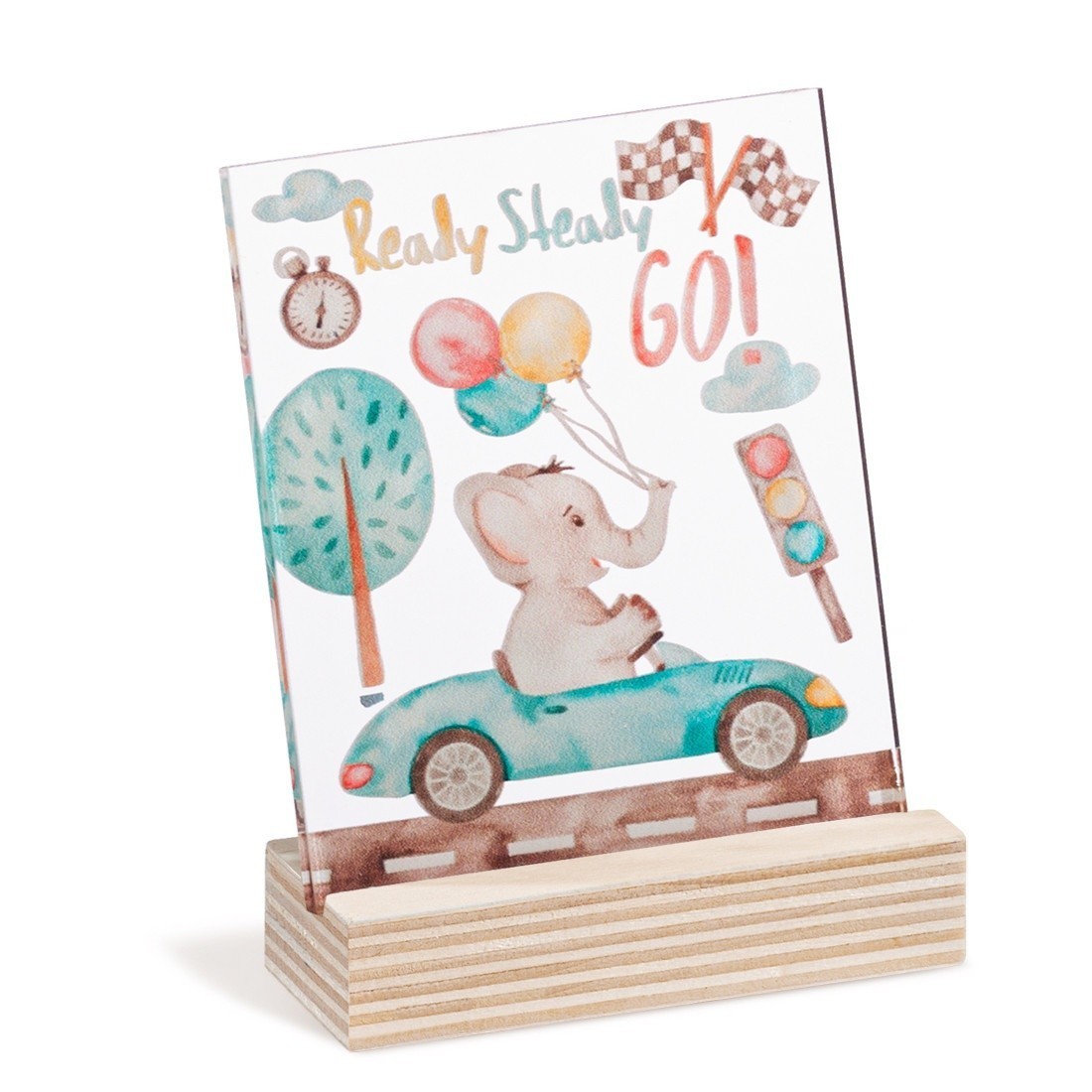 Ξύλινη βάση με παραλληλόγραμμο print καδράκι σε διάφανο plexiglass. Η παράσταση απεικονίζει το ελεφαντάκι να συμμετέχει σε αγώνες φόρμουλας και σύνθημα "READY, STEADY, GO".