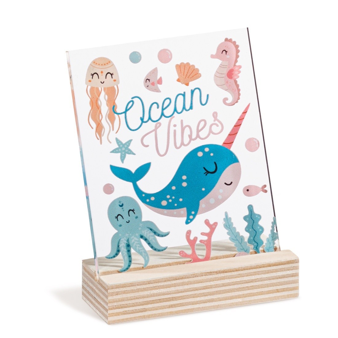 Ξύλινη βάση με παραλληλόγραμμο print καδράκι σε διάφανο plexiglass. Η παράσταση απεικονίζει το βυθό με τη φάλαινα, τη μέδουσα, το χταπόδι και τον ιππόκαμπο σε "Ocean Vibes".