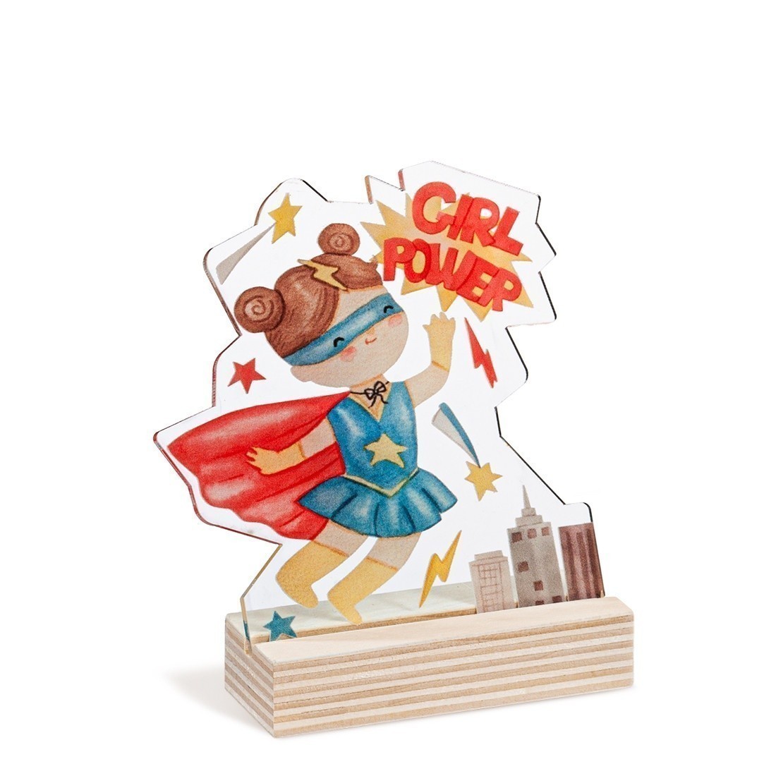 Ξύλινη βάση με print plexiglass κοπτικό. Η παράσταση απεικονίζει σε διάφανο χρώμα την Super Girl power.