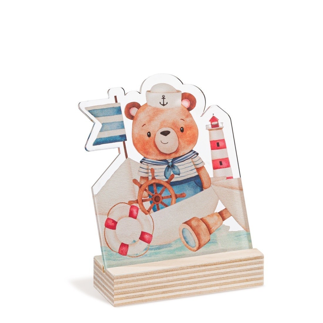 Ξύλινη βάση με print plexiglass κοπτικό. Η παράσταση απεικονίζει σε διάφανο χρώμα το αρκουδάκι να αρμενίζει με τη βαρκούλα του.