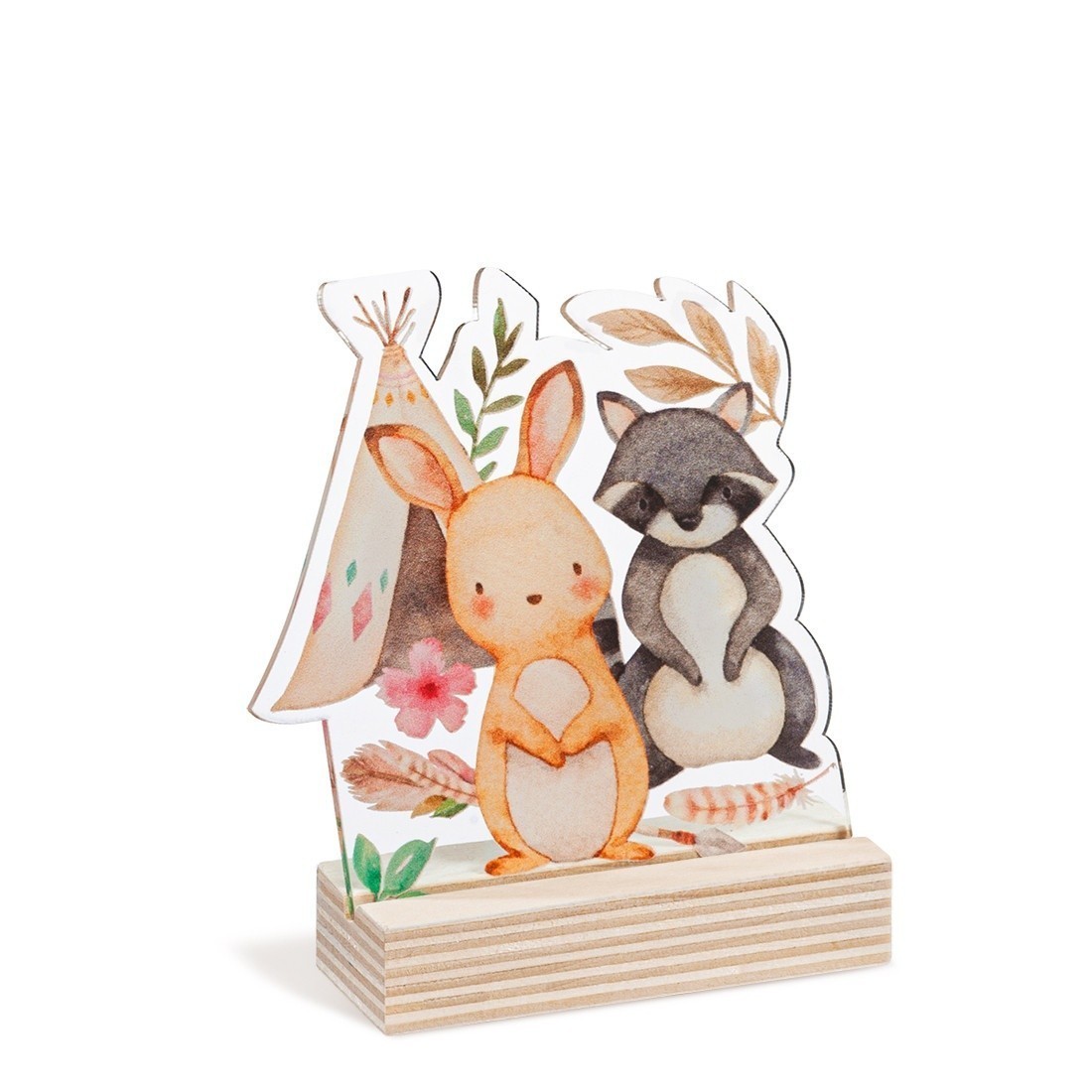 Ξύλινη βάση με print plexiglass κοπτικό. Η παράσταση απεικονίζει σε διάφανο χρώμα τη λαγουδίνα και την αλεπού σε boho style.