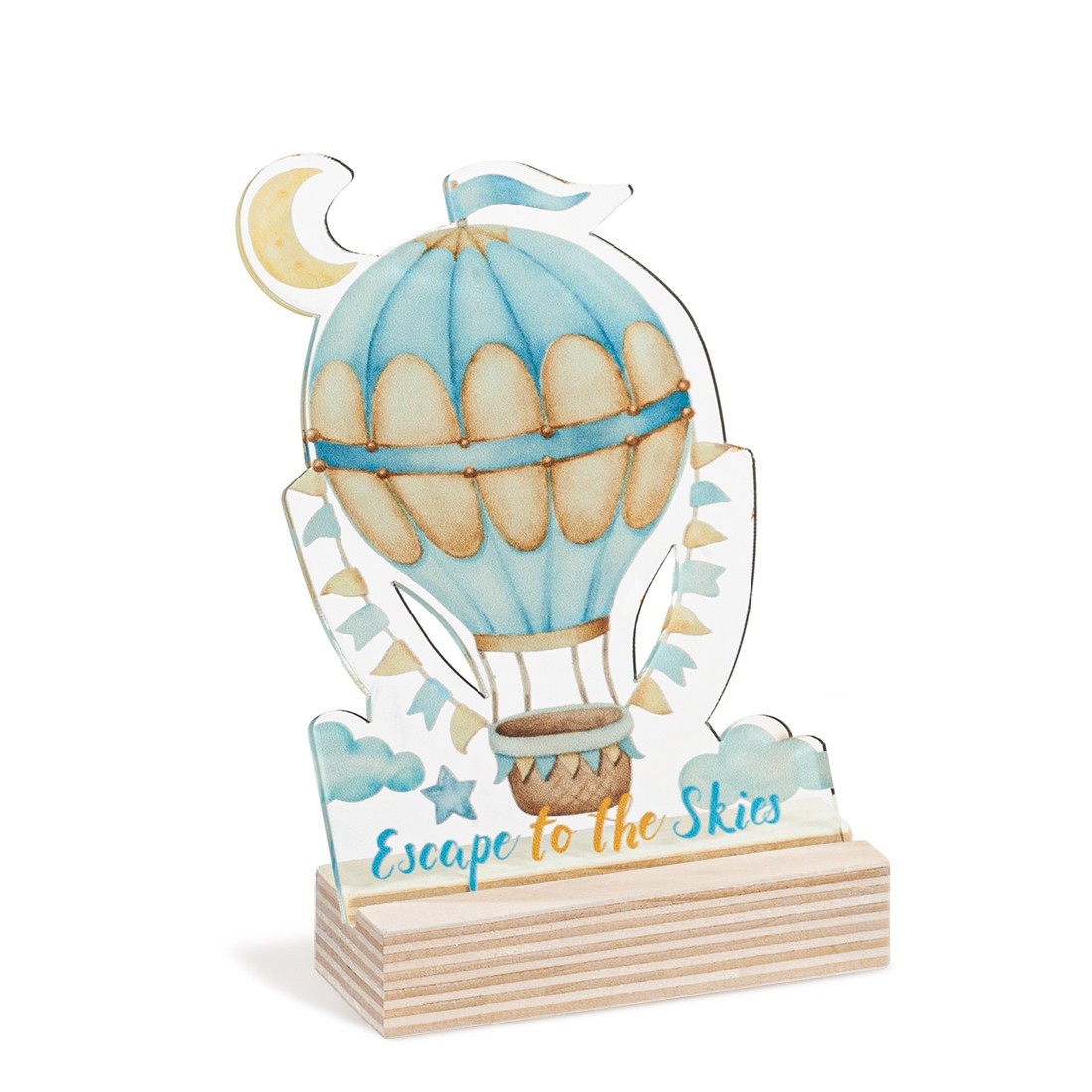 Ξύλινη βάση με print plexiglass κοπτικό. Η παράσταση απεικονίζει σε διάφανο χρώμα το αερόστατο σε σιέλ αποχρώσεις δίνοντας το σύνθημα " Escape to the skies".