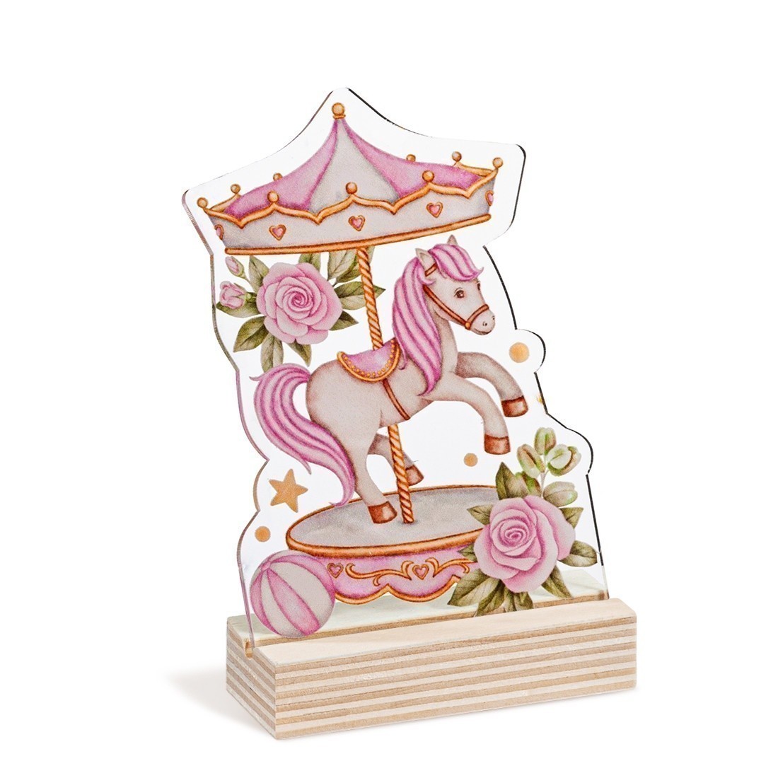 Ξύλινη βάση με print plexiglass κοπτικό. Η παράσταση απεικονίζει σε διάφανο χρώμα ένα καρουζελ ροζ.