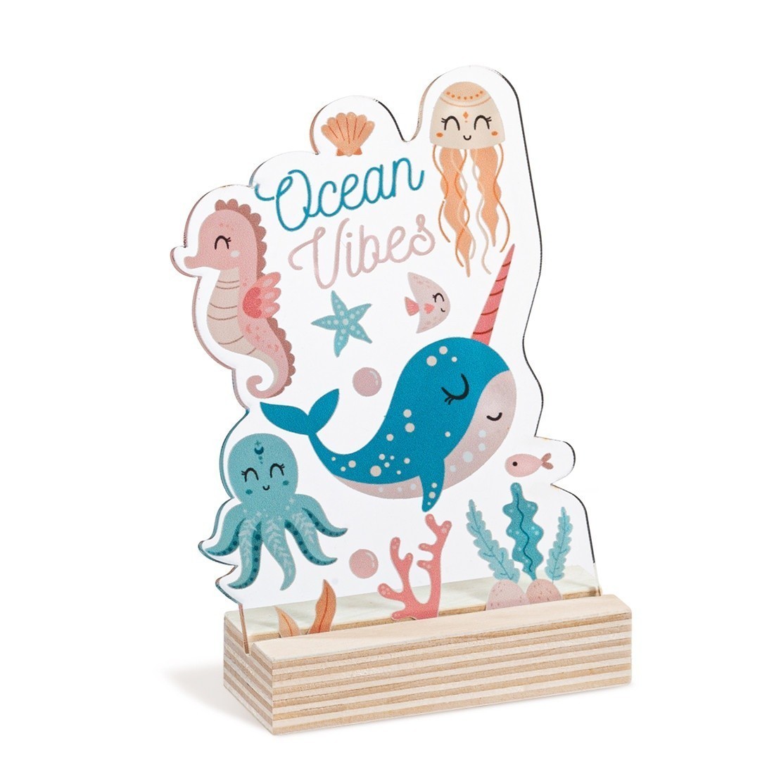 Ξύλινη βάση με print plexiglass κοπτικό. Η παράσταση απεικονίζει σε διάφανο χρώμα το βυθό με τη φάλαινα, τη μέδουσα, το χταπόδι και τον ιππόκαμπο σε "Ocean Vibes".