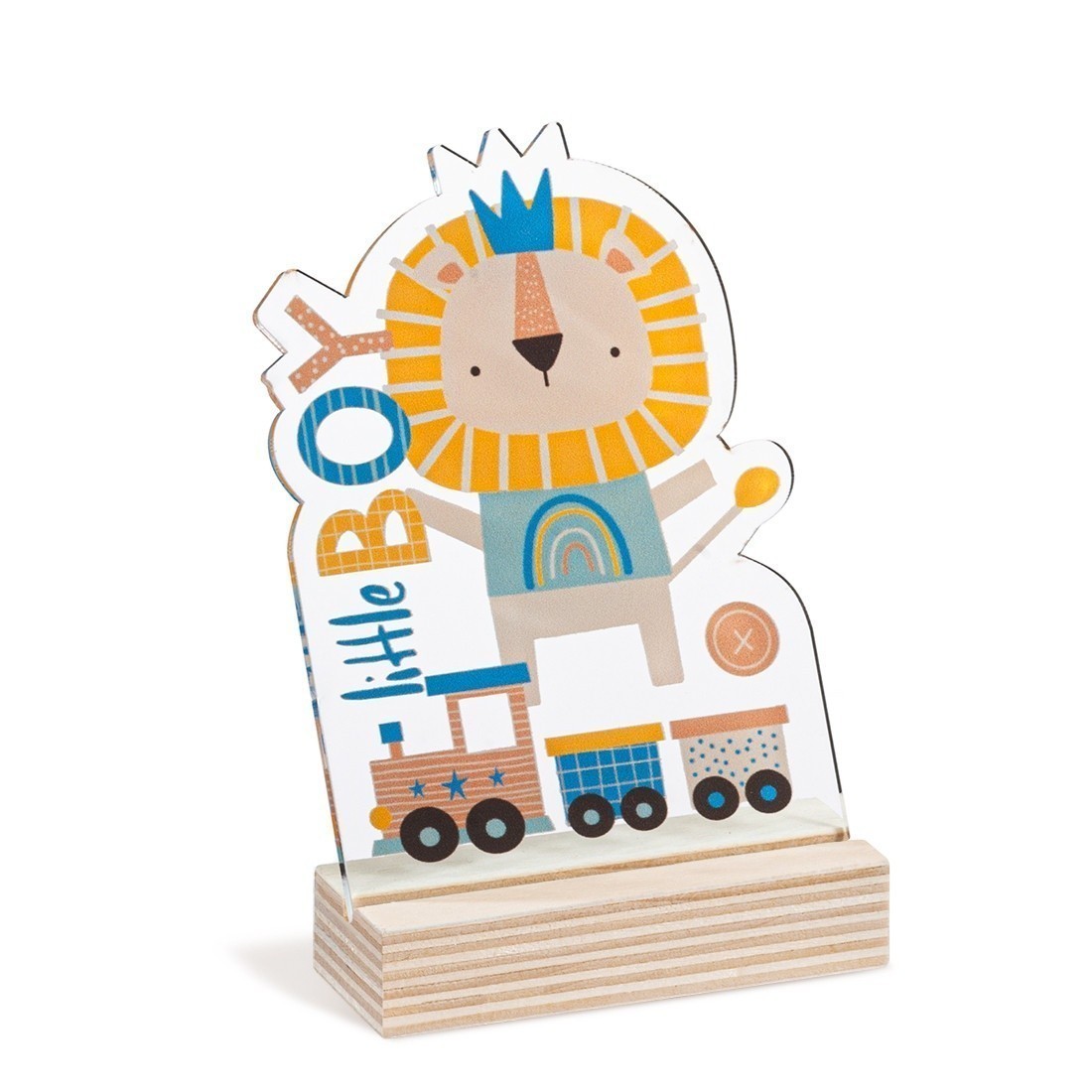 Ξύλινη βάση με print plexiglass κοπτικό. Η παράσταση απεικονίζει σε διάφανο χρώμα ένα λιονταράκι σε σιέλ αποχρώσεις.