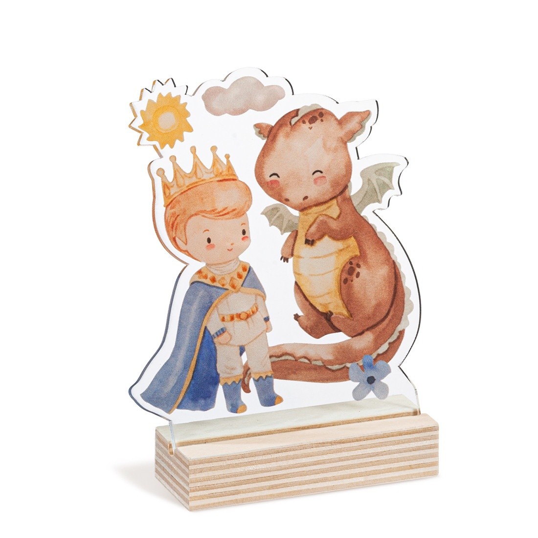 Ξύλινη βάση με print plexiglass κοπτικό. Η παράσταση απεικονίζει σε διάφανο χρώμα τον πρίγκιππα παρέα με τον δράκο του παραμυθιού.