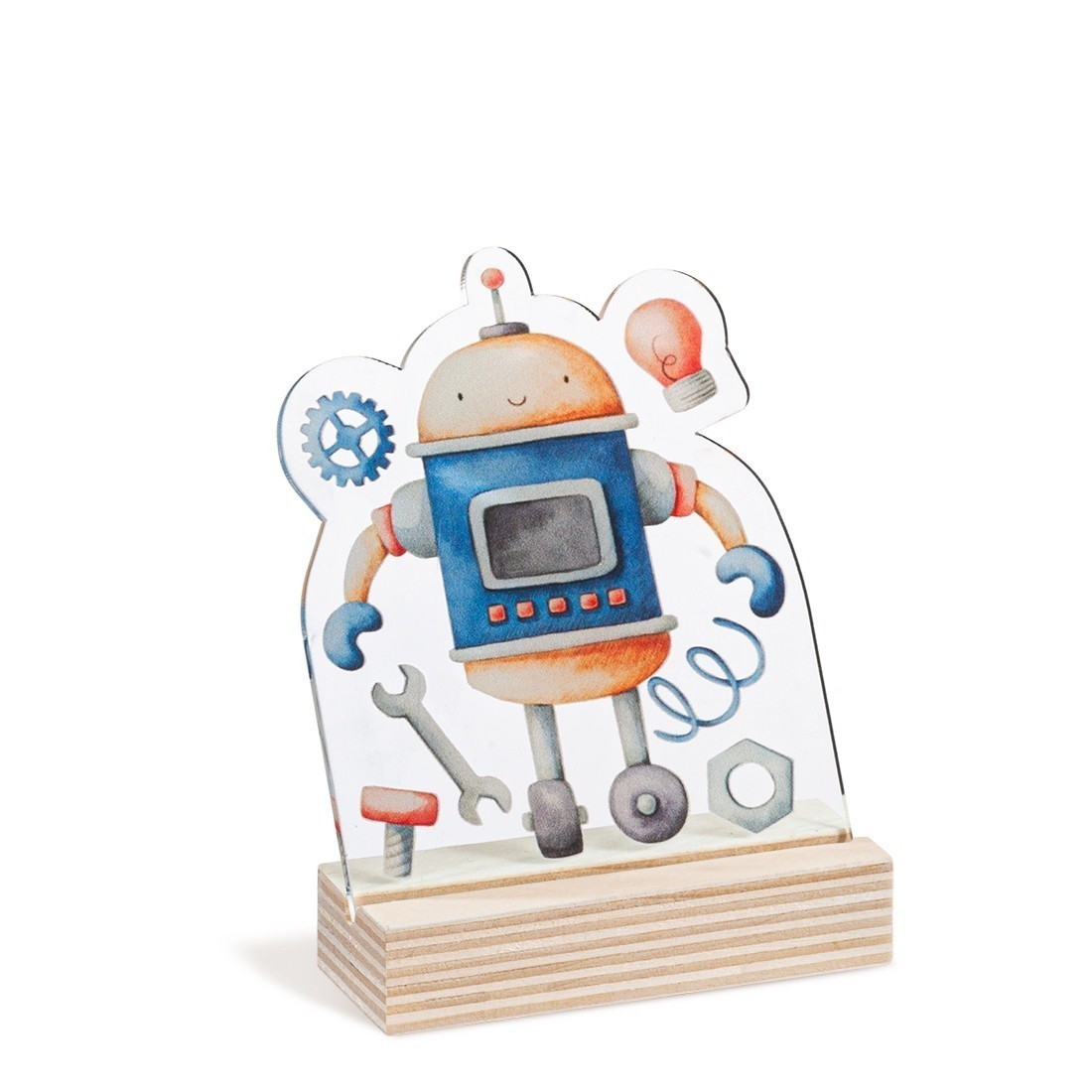 Ξύλινη βάση με print plexiglass κοπτικό. Η παράσταση απεικονίζει σε διάφανο χρώμα ένα ρομπότ με φόντο διάφορα εργαλεία.