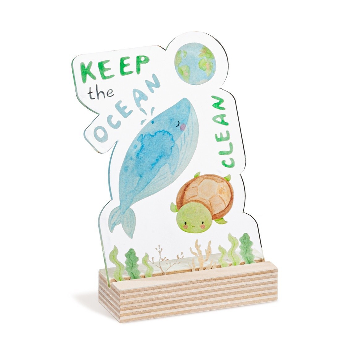 Ξύλινη βάση με print plexiglass κοπτικό. Η παράσταση απεικονίζει σε διάφανο χρώμα το βυθό και σύνθημα "Keep the Ocean Clean".