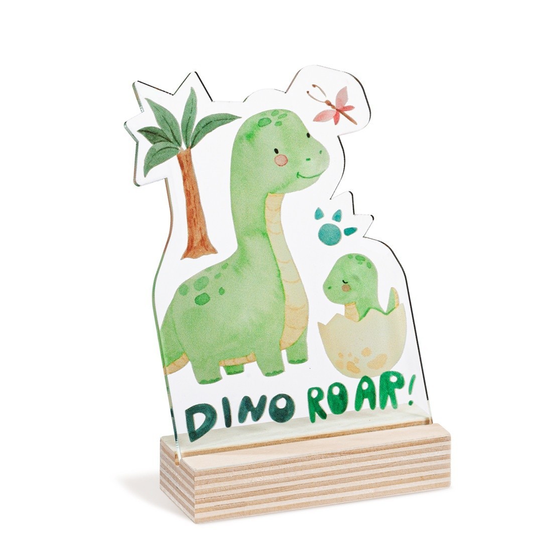 Ξύλινη βάση με print plexiglass κοπτικό. Η παράσταση απεικονίζει σε διάφανο χρώμα τον Dino το δεινοσαυράκι .