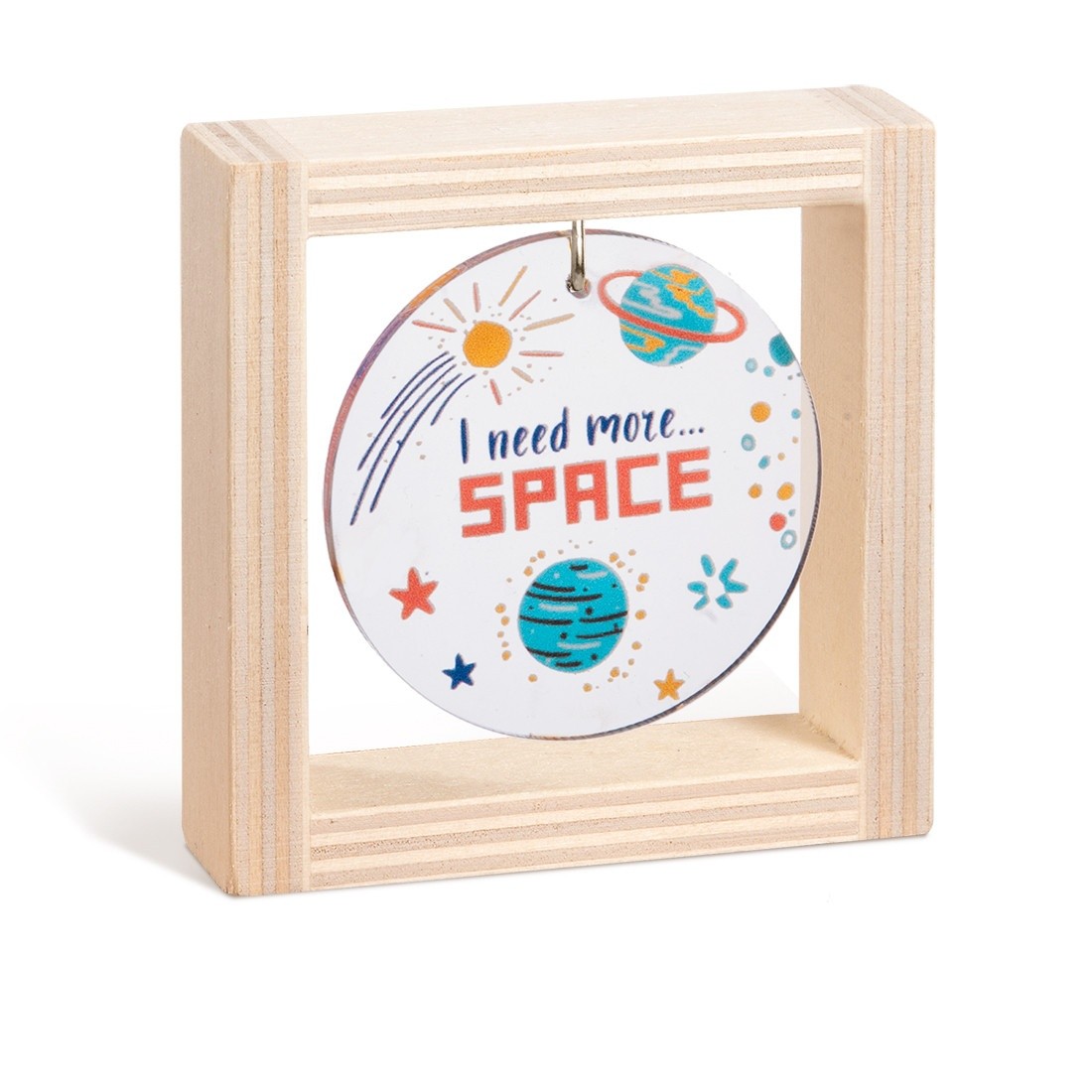 Ξύλινο τετράγωνο καδράκι με στρογγυλή print παράσταση από plexiglass σε διάφανο χρώμα. Η παράσταση απεικονίζει το διάστημα και moto "I need more…SPACE".