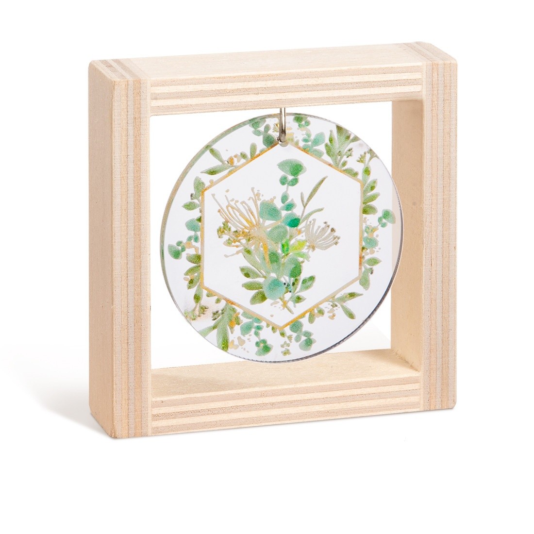 Ξύλινο τετράγωνο καδράκι με στρογγυλή print παράσταση από plexiglass σε διάφανο χρώμα. Η παράσταση απεικονίζει ένα μπουκέτο πράσινου ευκάλυπτου μέσα σε στεφανάκι με γεωμετρικό μοτίβο.