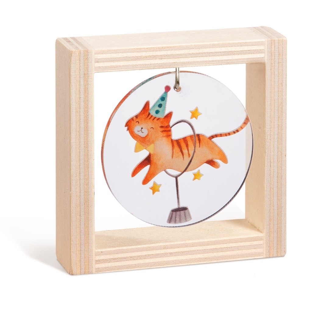 Ξύλινο τετράγωνο καδράκι με στρογγυλή print παράσταση από plexiglass σε διάφανο χρώμα. Η παράσταση απεικονίζει την τίγρη να κάνει ακροβατικά στο τσίρκο.