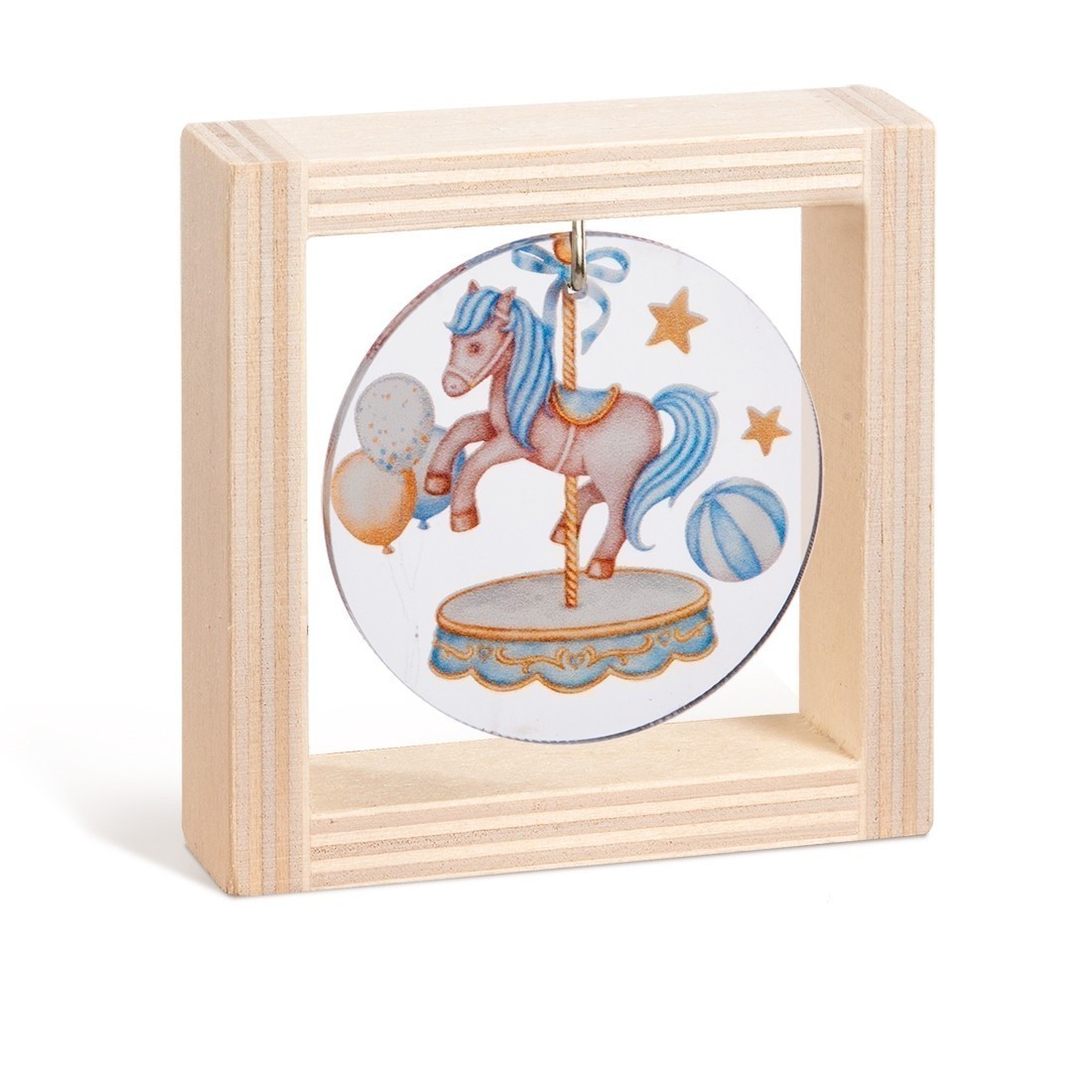 Ξύλινο τετράγωνο καδράκι με στρογγυλή print παράσταση από plexiglass σε διάφανο χρώμα. Η παράσταση απεικονίζει το σιέλ καρουζέλ.