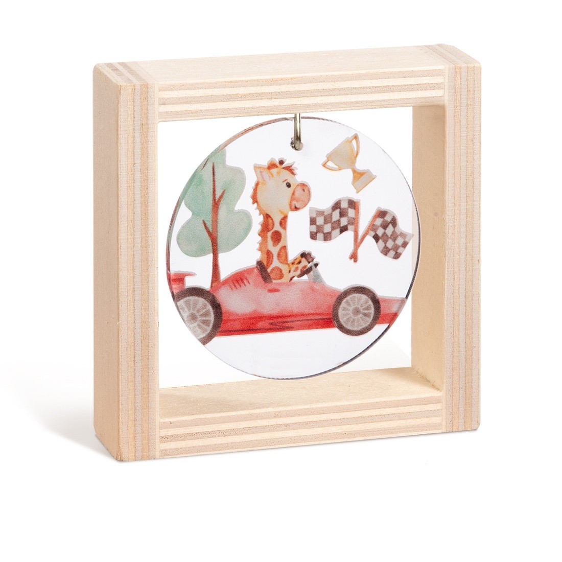 Ξύλινο τετράγωνο καδράκι με στρογγυλή print παράσταση από plexiglass σε διάφανο χρώμα. Η παράσταση απεικονίζει την καμηλοπάρδαλη να συμμετέχει σε αγώνες φόρμουλας.