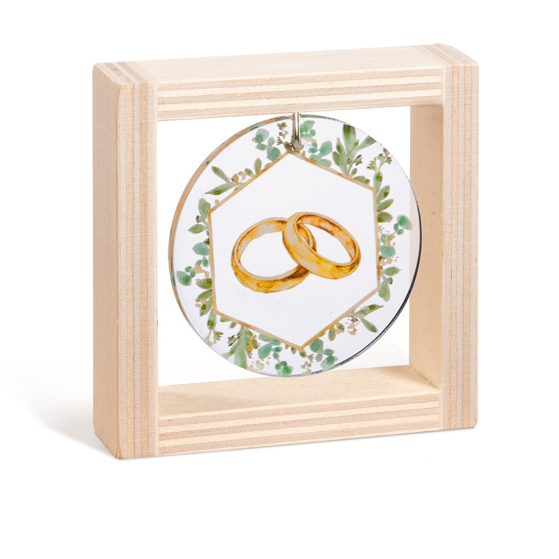 Ξύλινο τετράγωνο καδράκι με στρογγυλή print παράσταση από plexiglass σε διάφανο χρώμα. Η παράσταση απεικονίζει χρυσές βέρες μέσα σε ένα στεφανάκι από πράσινο ευκάλυπτο.