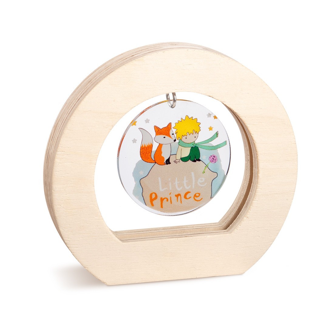 Ξύλινο οβάλ καδράκι σε natural χρώμα. Το εσωτερικό είναι διακοσμημένο με κρεμαστή plexiglass print παράσταση σε στρογγυλό σχήμα με θέμα την κλασσική παράσταση του μικρού πρίγκιπα από το παραμύθι .