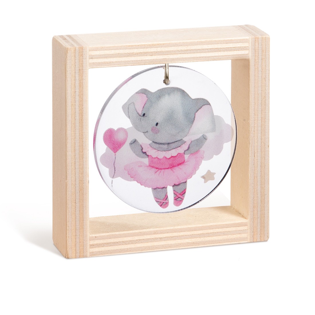 Ξύλινο τετράγωνο καδράκι με στρογγυλή print παράσταση από plexiglass σε διάφανο χρώμα. Η παράσταση απεικονίζει την ελεφαντίνα μπαλαρίνα σε ροζ αποχρώσεις.