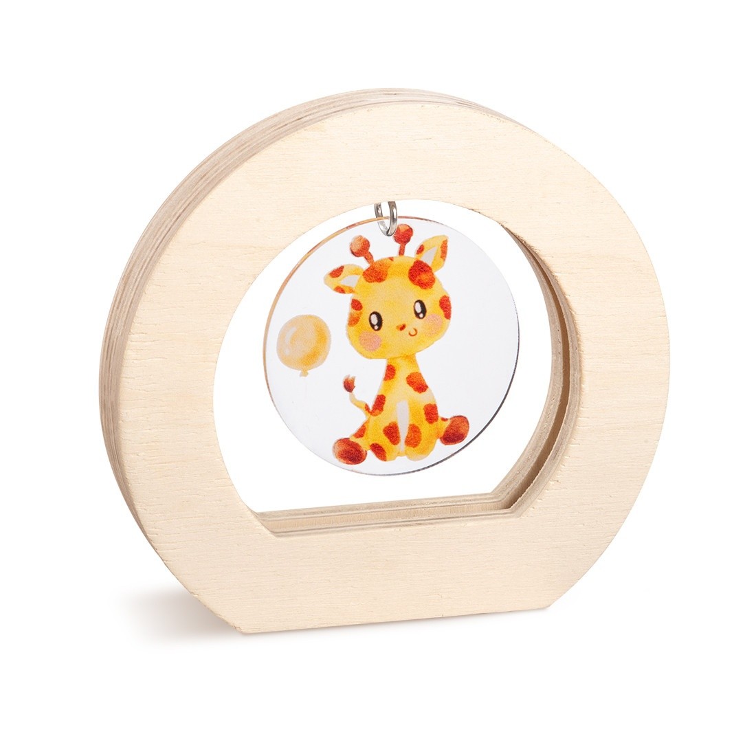 Ξύλινο οβάλ καδράκι σε natural χρώμα. Το εσωτερικό είναι διακοσμημένο με κρεμαστή plexiglass print παράσταση σε στρογγυλό σχήμα με θέμα baby καμηλοπάρδαλη.