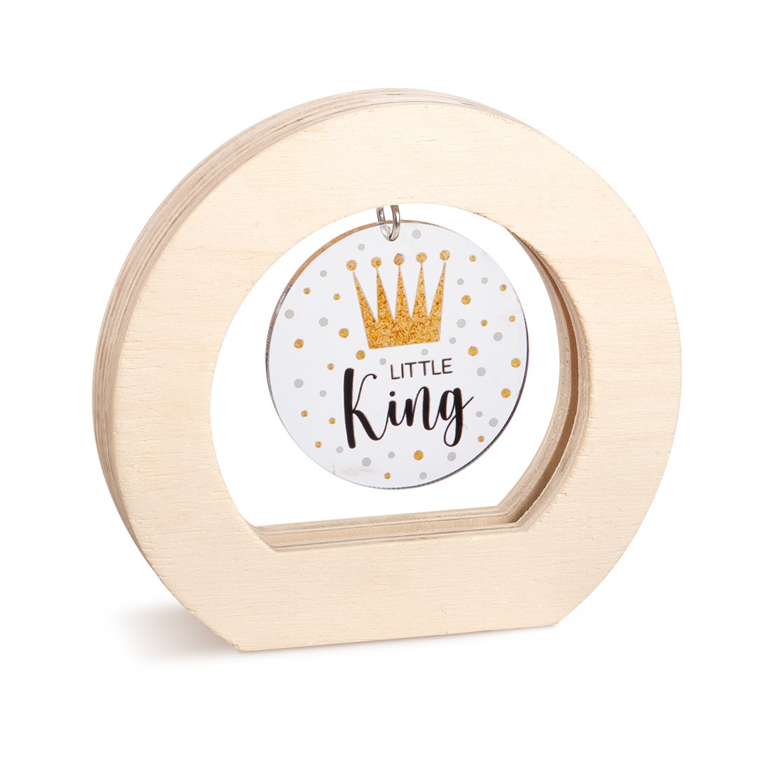 Ξύλινο οβάλ καδράκι σε natural χρώμα. Το εσωτερικό είναι διακοσμημένο με κρεμαστή plexiglass print παράσταση σε στρογγυλό σχήμα με θέμα χρυσή κορώνα και μότο Little King .