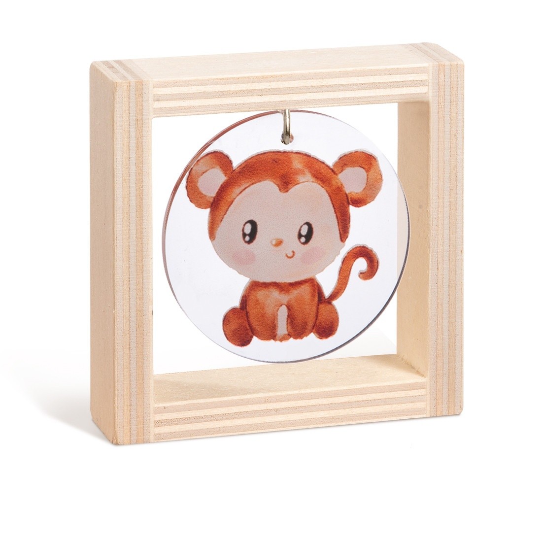 Ξύλινο τετράγωνο καδράκι με στρογγυλή print παράσταση από plexiglass σε διάφανο χρώμα. Η παράσταση απεικονίζει ένα baby μαμουδάκι.