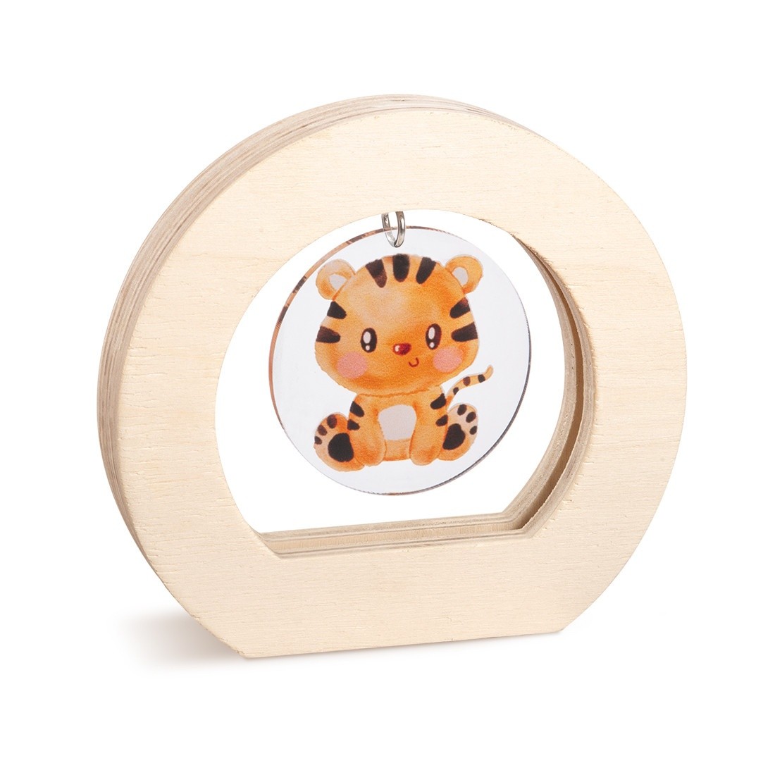 Ξύλινο οβάλ καδράκι σε natural χρώμα. Το εσωτερικό είναι διακοσμημένο με κρεμαστή plexiglass print παράσταση σε στρογγυλό σχήμα με θέμα baby τίγρη .