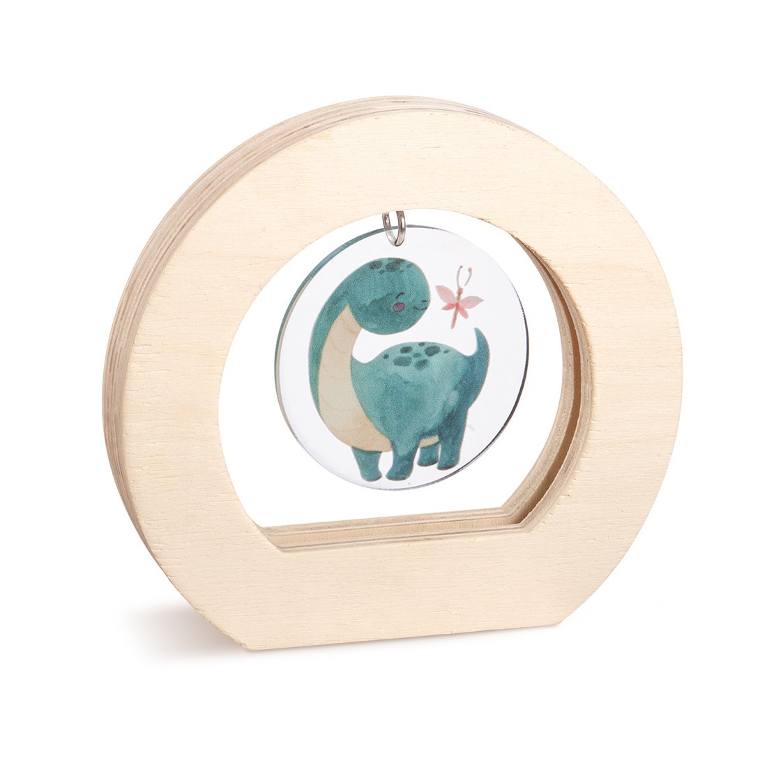 Ξύλινο οβάλ καδράκι σε natural χρώμα. Το εσωτερικό είναι διακοσμημένο με κρεμαστή plexiglass print παράσταση σε στρογγυλό σχήμα με θέμα το δεινοσαυράκι σε κυπαρισσί απόχρωση .