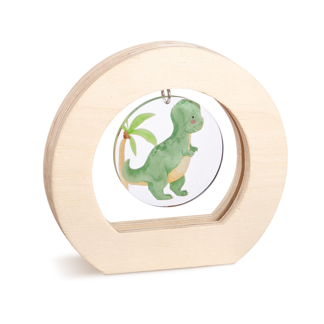 Ξύλινο οβάλ καδράκι σε natural χρώμα. Το εσωτερικό είναι διακοσμημένο με κρεμαστή plexiglass print παράσταση σε στρογγυλό σχήμα με θέμα το δεινοσαυράκι σε βεραμάν απόχρωση .