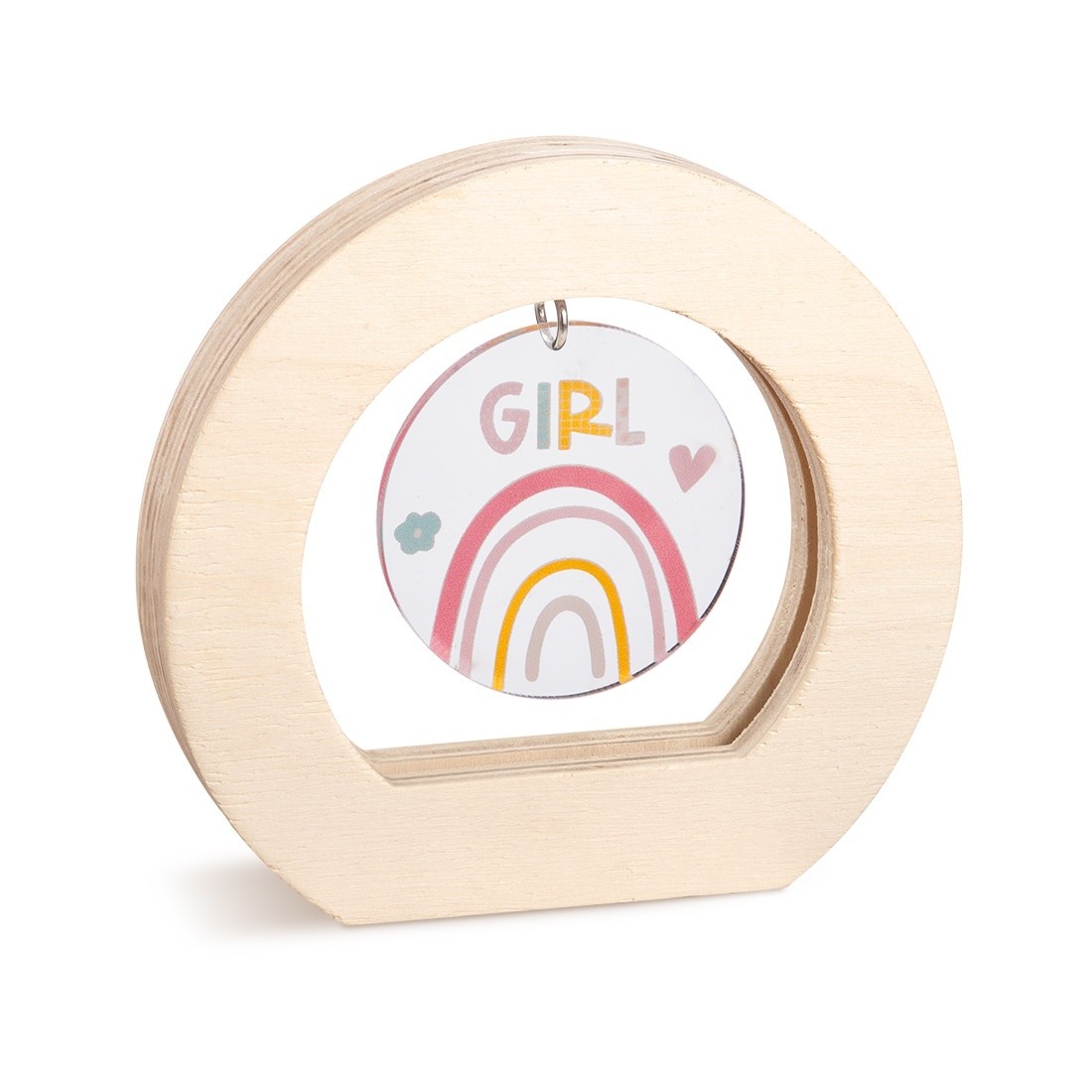 Ξύλινο οβάλ καδράκι σε natural χρώμα. Το εσωτερικό είναι διακοσμημένο με κρεμαστή plexiglass print παράσταση σε στρογγυλό σχήμα με θέμα το ουράνιο τόξο σε κοριτσίστικες ροζ αποχρώσεις .