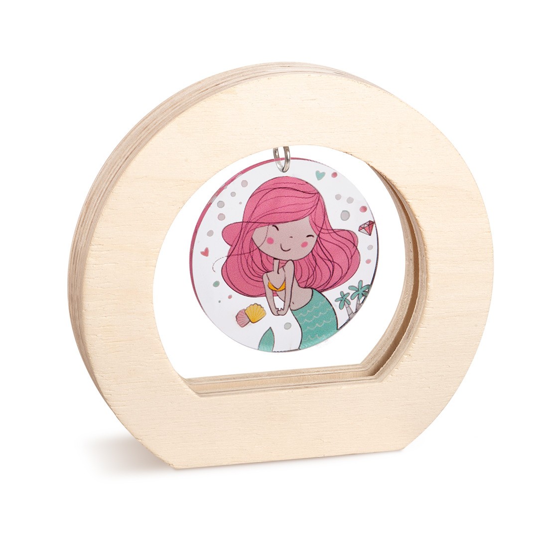 Ξύλινο οβάλ καδράκι σε natural χρώμα. Το εσωτερικό είναι διακοσμημένο με κρεμαστή plexiglass print παράσταση σε στρογγυλό σχήμα με θέμα τη γοργόνα .