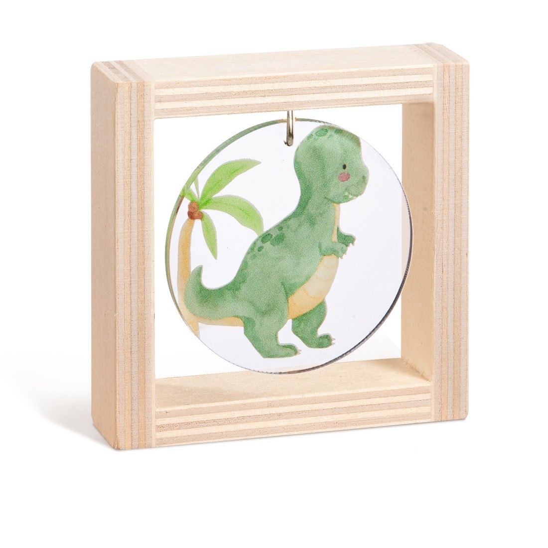 Ξύλινο τετράγωνο καδράκι με στρογγυλή print παράσταση από plexiglass σε διάφανο χρώμα. Η παράσταση απεικονίζει ένα βεραμάν δεινόσαυρο.