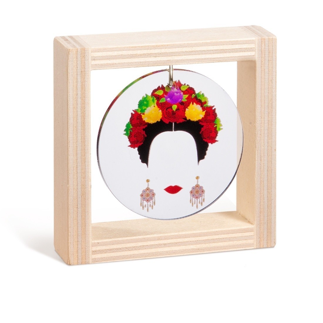 Ξύλινο τετράγωνο καδράκι με στρογγυλή print παράσταση από plexiglass σε διάφανο χρώμα. Η παράσταση απεικονίζει τη Frida Khalo.