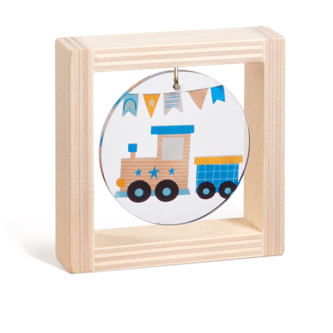 Ξύλινο τετράγωνο καδράκι με στρογγυλή print παράσταση από plexiglass σε διάφανο χρώμα. Η παράσταση απεικονίζει το τρενάκι σε σιέλ αποχρώσεις .