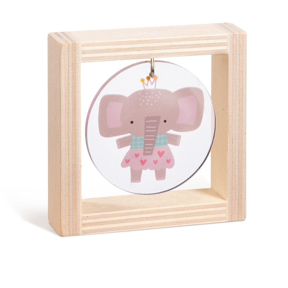 Ξύλινο τετράγωνο καδράκι με στρογγυλή print παράσταση από plexiglass σε διάφανο χρώμα. Η παράσταση απεικονίζει την ελεφαντίνα σε ροζ αποχρώσεις.